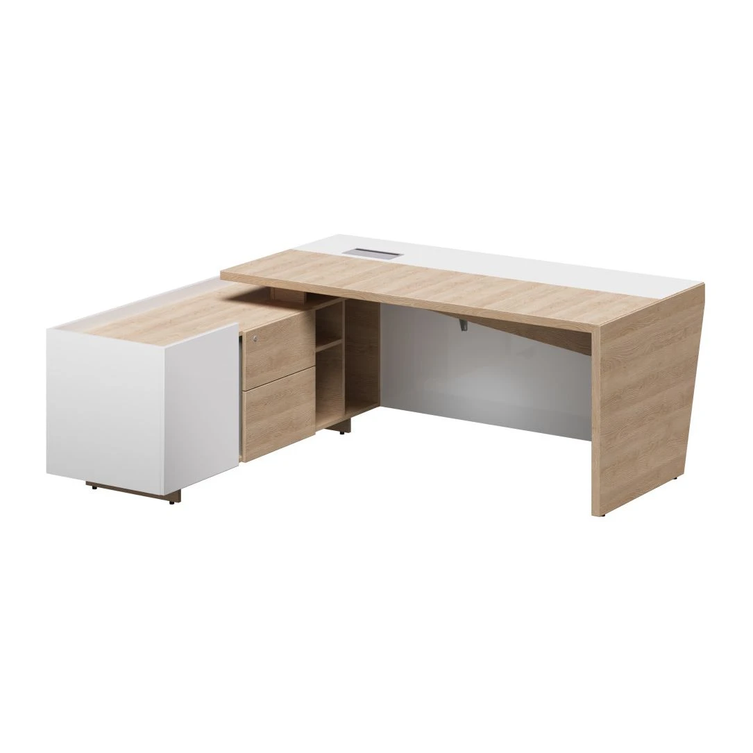 Стол рабочий (угловой) с тумбой, блок розеток, левый new 200,5х180х76 Plaza Director Дуб песочный/Белый глянец